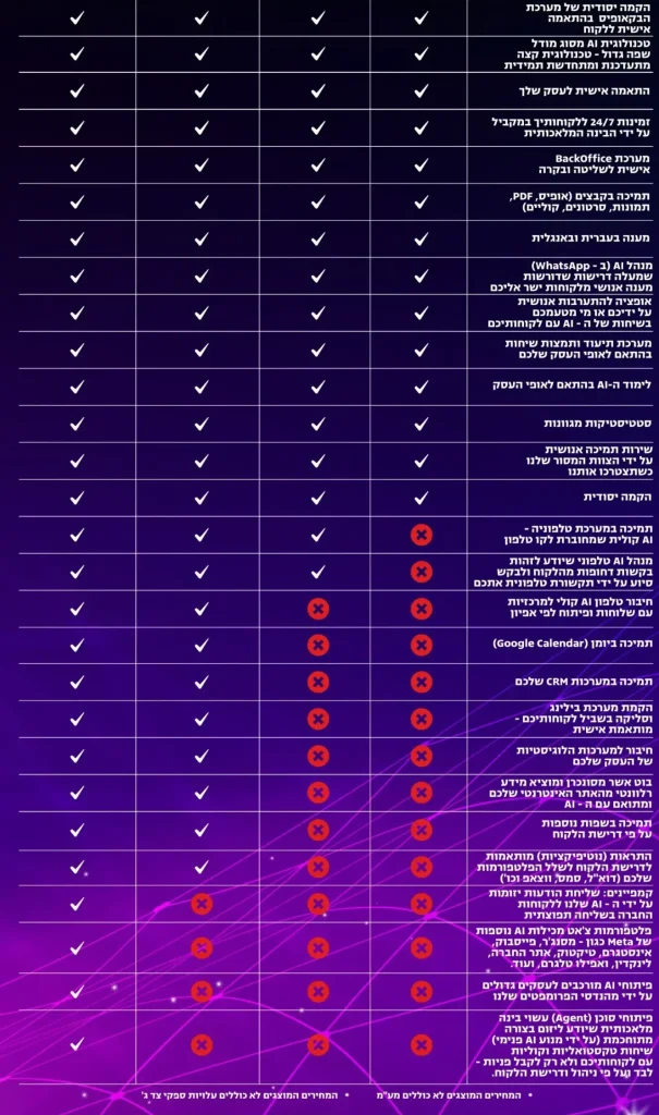 עם שילוב מושלם של אוטומציה, יצירתיות וטכנולוגיה מתקדמת, העסק שלכם גם יזכה לחיסכון משמעותי, גם להגדלת הכנסות וגם לייצוג של בידול וחדשנות בתחום השירות והתקשורת.